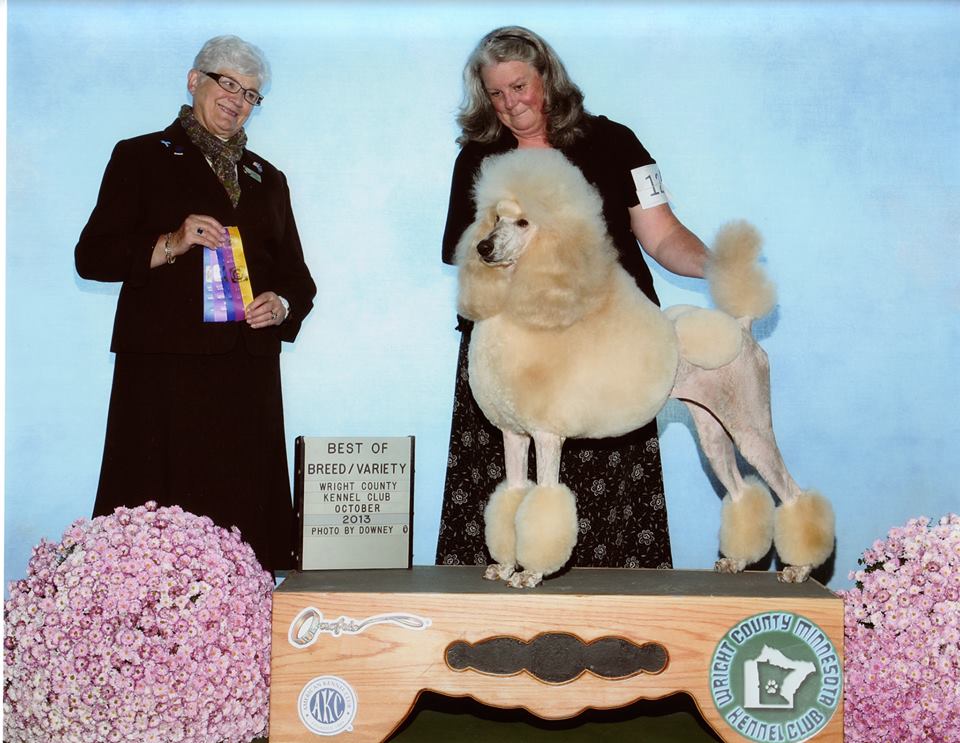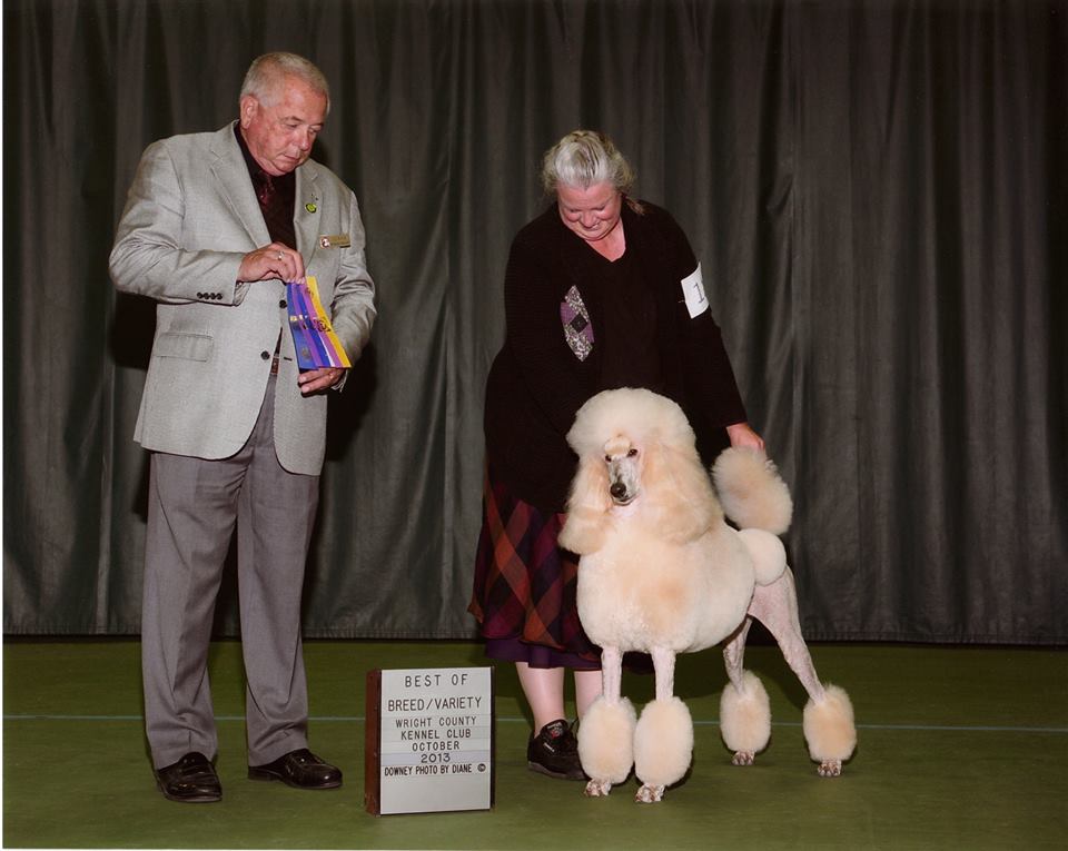 | Cerise Demis Apry ("Drew") 6-14-13 Drew became Canadian Champion! She was undefeated in the classes and finished with 2 BOB over a special and 2 group 4's all owner/handled. 6-23-13 Drew was WB/BOS for her first 2 AKC points and from the bred-by class! 10/5/13 and 10/6/13 Wright county Show Drew was WB/BW/BV both days for 2 more points. She gained these points from the bred-by class again! Judges were Muriel Purkheiser and Richard Miller. We had fun in group and appreciate the coaching and support of our fellow poodle pals! |
